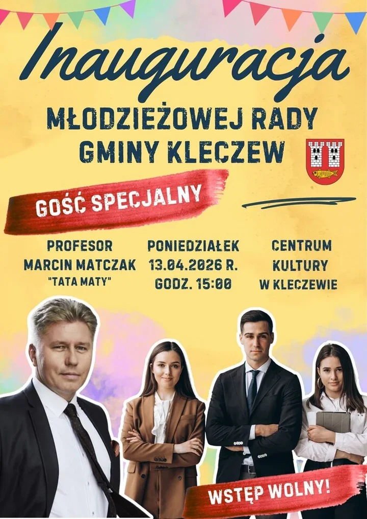 W poniedziałek, 13 kwietnia 2026 roku, o godzinie 15:00 w Centrum Kultury w Kleczewie odbędzie się uroczysta inauguracja pierwszej w historii gminy Młodzieżowej Rady Gminy Kleczew. Zaproszenie do udziału skierowali przewodnicząca Rady Miejskiej w Kleczewie Alicja Piaskowska oraz burmistrz Gminy i Miasta Kleczew Mariusz Musiałowski.