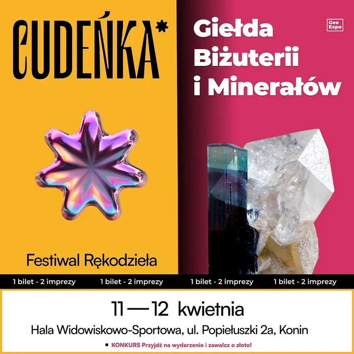 W Hali Widowiskowo–Sportowej w Koninie przez dwa kwietniowe dni zrobi się tłoczno od rzeczy, których nie da się kupić przypadkiem. Obok stoisk z rękodziełem pojawią się minerały, skamieniałości i biżuteria, a cały ten zestaw ma przyciągnąć tych, którzy szukają przedmiotów z charakterem. Jedna wejściówka otworzy drzwi do obu wydarzeń, więc tego samego dnia można przejść od autorskich form do naturalnych kamieni i ich historii.