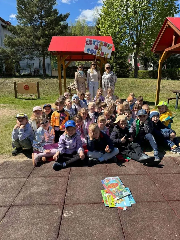 Do wspólnego czytania zasiedli mali słuchacze z grup Misie i Zajączki. Na trawie, w swobodnej atmosferze, dzieci mogły skupić się nie na szkolnym obowiązku, ale na samej przyjemności słuchania. I właśnie w tym tkwi siła tej akcji - książka wychodzi z biblioteki tam, gdzie najmłodsi czują się naturalnie i bezpiecznie 🙂