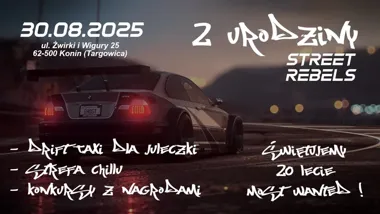 W sobotę 30 sierpnia 2025 roku w Koninie odbędzie się jednodniowe wydarzenie motoryzacyjne organizowane przez lokalną grupę Street Rebels. Impreza zaplanowana jest od godz. 13:00 na miejskim targowisku przy ul. Żwirki i Wigury 25a. W programie przewidziano pokazy, strefy tematyczne oraz zbiórkę środków na pomoc rehabilitacyjną dla dziecka.